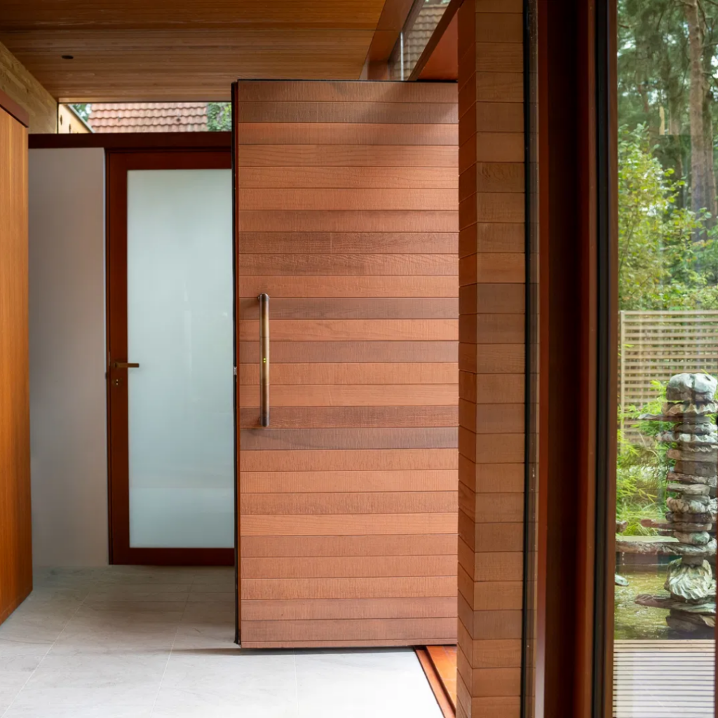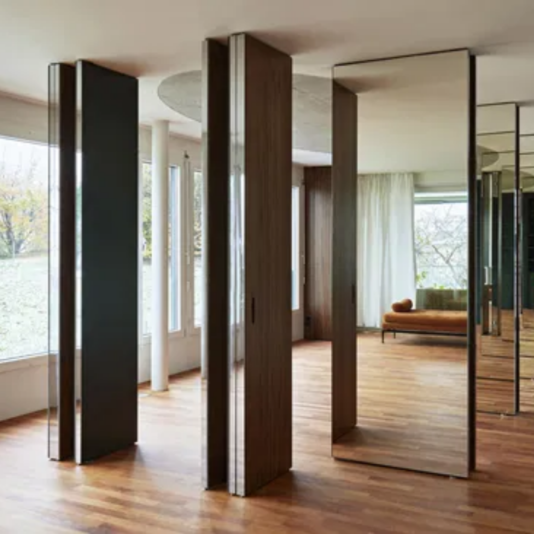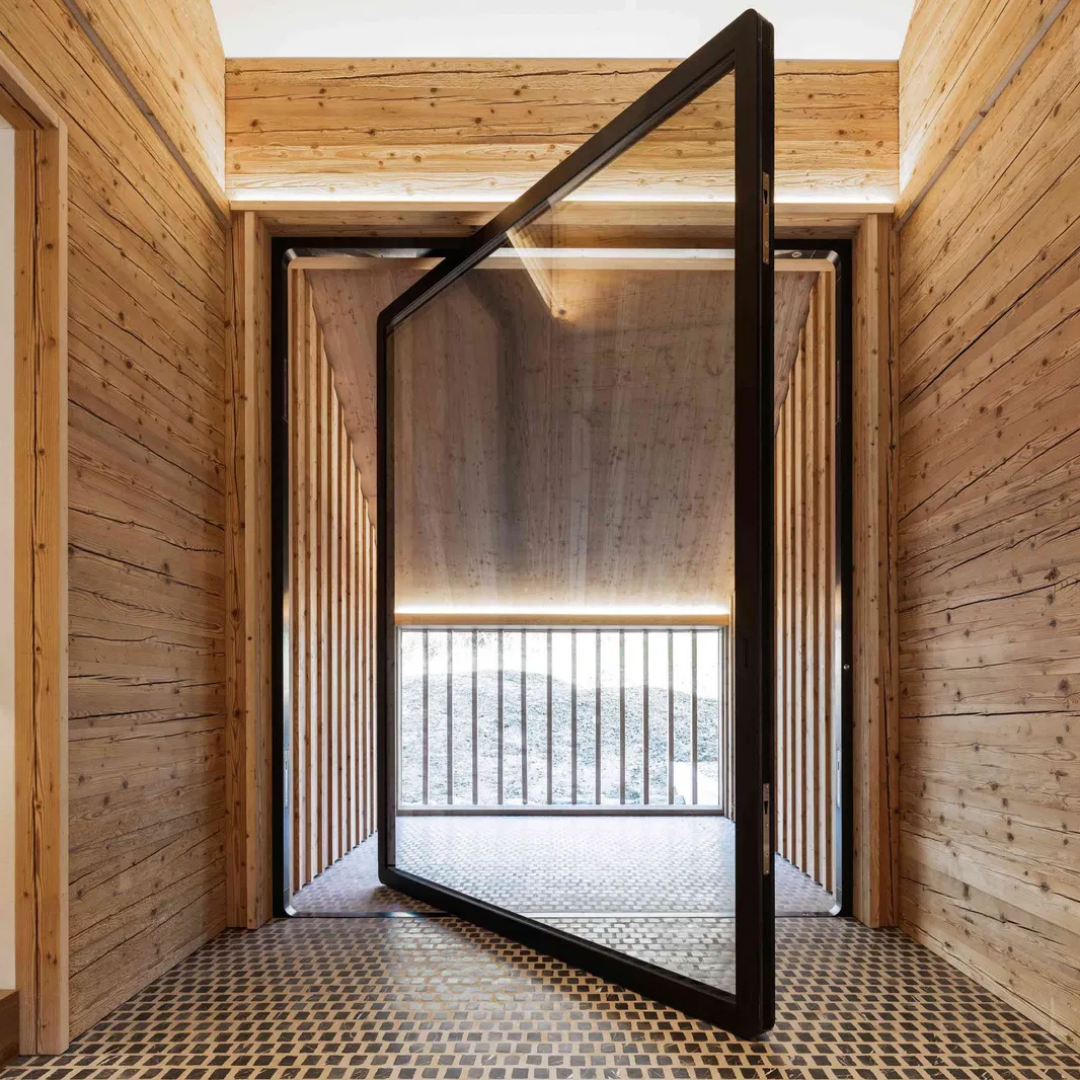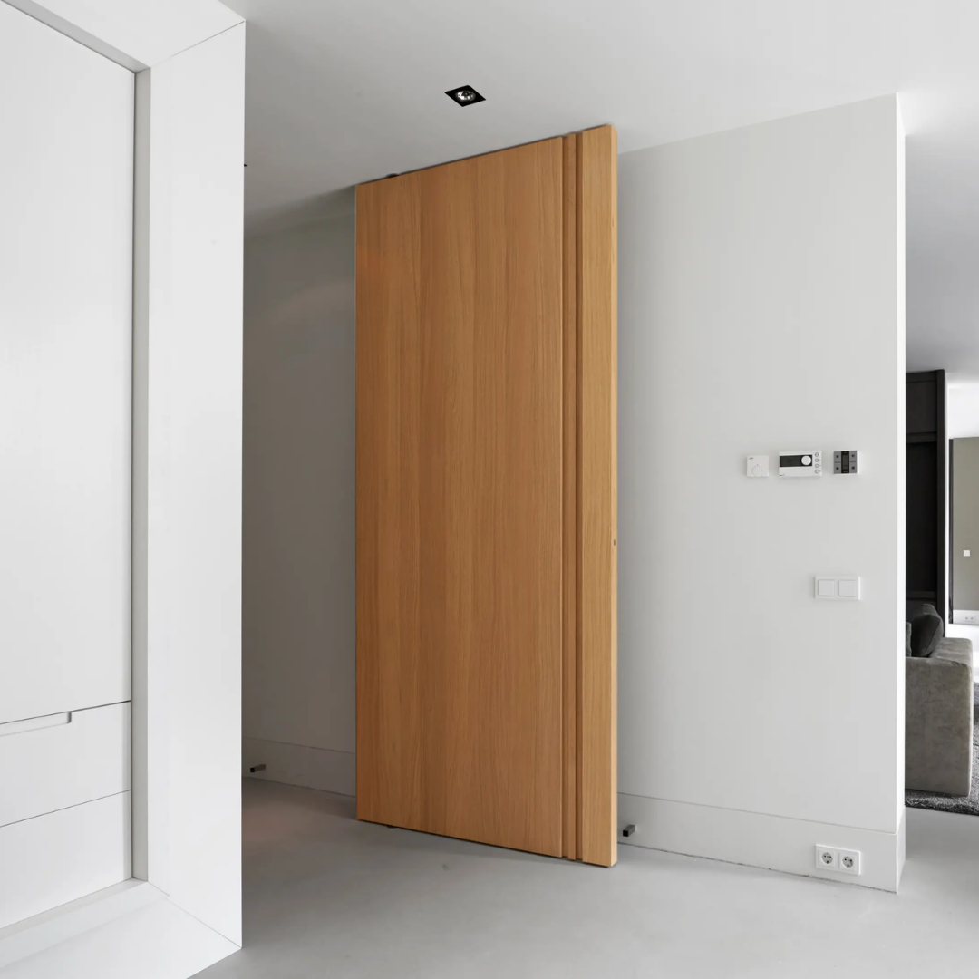 The systems enable smooth pivoting without visible floor or ceiling components and are designed to integrate seamlessly with architectural detailing and finishes.